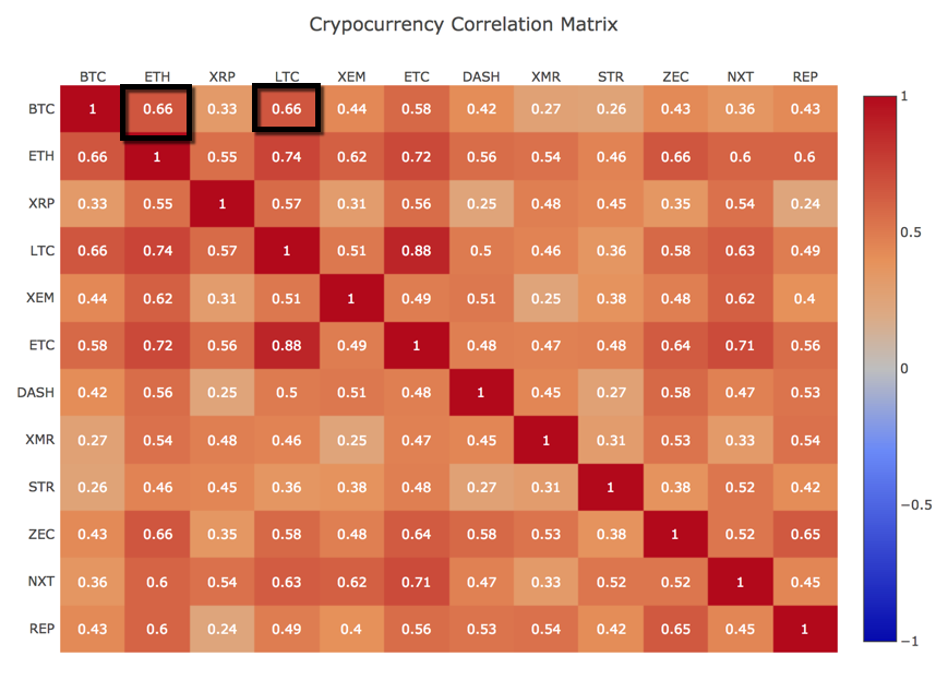 You can see that Ethereum (and LiteCoin) are 0.66 correlated with Bitcoin.